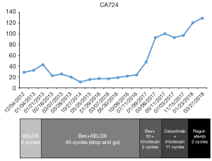 Small bowel adenocarcinoma (SBA) is usually a rare and fatal gastrointestinal malignancy, which represents a third of all small bowel cancers (1). Although rare, its incidence is rising with an estimated 10,190 new cases reported in the United States in 2017 (1-3). Due to its non-specific and heterogeneous presentation, most SBA patients are diagnosed with late-stage disease (4). Surgical resection is the optimal therapy for localized and regional disease. In patients with clinically advanced disease, several retrospective studies have demonstrated that patients receiving systemic chemotherapy attain clinical benefits with a median overall survival of 13 months when compared with only 4 months in patients with best-supportive care (4). To date, no standard treatment guideline has been established for advanced SBA. Therefore, clinical management of metastatic SBA is very challenging. However, based on multiple prospective studies, oxaliplatin-based chemotherapy regimens are most frequently used to treat advanced SBA (5,6). Recently, Horimatsu et al. reported a median progression-free survival (PFS) of 5.4 and a median overall survival (OS) of 17.3 months in Japanese patients with advanced SBA treated with mFOLFOX6 (7). Targeted agents such as bevacizumab and cetuximab have improved clinical outcomes for CRC patients, and may have clinical activity in SBA, which has high levels of vascular endothelial growth factor receptor A (VEGFR-A, 96%) and epidermal growth factor receptor (EGFR, 71%) (8). The first prospective study that evaluated the efficacy of CAPOX with bevacizumab in patients with SBA and AAC (ampullary adenocarcinoma) demonstrated an effective and well-tolerated potential therapy with a median PFS of 8.7 months and a median OS of 12.9 months (9). In addition, Aydin et al. evaluated the efficacy of bevacizumab along with the chemotherapy regimens FOLFOX and FOLFIRI and demonstrated greater clinical efficacy than chemotherapy alone (10). However, treatment outcome in advanced SBA patients is still unsatisfactory. Collaborative clinical trials are needed to improve treatment outcome in this orphan tumor. In this study, we report a case of an advanced small bowel adenocarcinoma patient with a long PFS of more than 3 years, whose treatment plan was tailored by analyzing her genetic background and drug sensitivity.