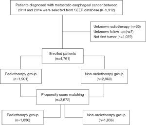 All statistical analyses were performed using the SPSS statistical software (version 22.0; IBM Corporation). Propensity score matching model was performed to reduce the bias of patients’ selection and obtain the balanced population of radiotherapy and non-radiotherapy group. The standardized differences for matched variables were less than 0.1. Chi-square test was used to identify the differences of two groups. Kaplan-Meier method was used to obtain survival information. Log-rank test and Cox regression analyses were implemented to evaluate covariates for OS and esophageal cause-specific survival (CSS). A value of P<0.05 were considered statistically significant for all analyses.