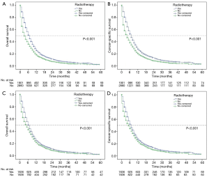 After propensity score matching, 3,672 of 4,761 patients were included (1,836 for each of radiotherapy or non-radiotherapy group) (Table 1) and also found that radiotherapy improved OS and CSS (P<0.001) (Figure 2C,D). Radiotherapy showed significant 2-year survival benefits in patients with age older than 80 years (2-year OS, P=0.048; CSS, P=0.018), male (2-year OS, P=0.020; CSS, P=0.011), white race (2-year OS, P=0.038; CSS, P=0.006), squamous carcinoma (2-year OS, P=0.002; CSS, P<0.001), poor differentiation (2-year OS, P=0.002; CSS, P<0.001), brain (2-year OS, P<0.001; CSS, P<0.001) metastasis, other sites (sites except for the brain, bone, lung, and liver, 2-year OS, P<0.001; CSS, P<0.001), however, there were no statistically significant survival differences in patients with bone and liver metastasis, 1–2 or 3–4 metastatic sites (Table 4). Interestingly, no survival difference was found between chemotherapy alone and radiotherapy combined with chemotherapy (2-year OS, P=0.177; CSS, P=0.080). Cox regression demonstrated that radiotherapy was an independent prognostic factor which was significantly associated with longer mOS and mCSS in matched patients (Tables 2,3). In addition, metastatic disease to 1–2 sites (P<0.001) or 3–4 metastatic sites (P<0.001) of the brain, bone, lung and liver, age greater than 80 years (P≤0.030), uninsured status (P<0.001), male (P<0.001), poor differentiation (P≤0.047), non-chemotherapy treatment (P<0.001) were associated with poorer OS. While metastatic disease to 1–2 sites (P <0.001) or 3–4 sites (P<0.001), uninsured status (P<0.001), male (P<0.001), poor differentiation (P<0.001), non-chemotherapy treatment (P<0.001) were significantly associated with decreased CSS.