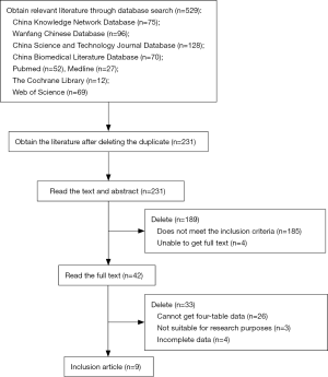 A total of 529 related articles were detected at the beginning of this study, and after thorough reading and screening by layer, 9 studies were accepted for our investigation finally (16-24). The literature screening process and results was as shown in Figure 1.