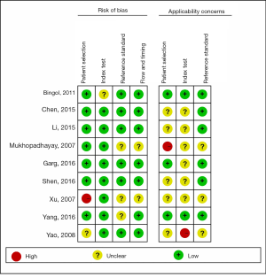The quality of the literature was evaluated with QUADAS-2 quality evaluation standard (13,14). The QUADAS-2 tool is mainly composed of case selection, evaluation test, gold standard, test procedure, and time interval. It uses “yes”, “no”, or “unclear” to answer the relevant question. The answer is then used to determine the methodological quality of the included studies.
