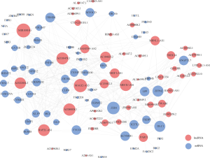 The ceRNA network involved 61 mRNAs, 44 lncRNAs and 22 miRNAs was visualized using Cytoscape software based on the 211 interactions among them (Figure 2). 181 interactions between lncRNAs and mRNAs were presented in Figure 3.