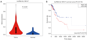 To identify the prognostic lncRNAs, we inspect the differentiate expression RNAs combined with the clinical data from the 365 GC samples in TCGA. Kaplan-Meier survival analysis was applied to analyze the correlation between lncRNA expression and clinical prognosis.