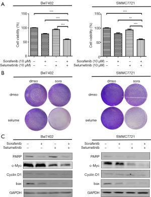 Because the MEK inhibitors selumetinib and trametinib abrogated the induction of ERK activation by sorafenib in the HCC cell lines, we accordingly hypothesized that MEK inhibitors could act synergistically with sorafenib to reduce the viability of HCC cells. The two HCC cell lines were treated with a range of concentrations of sorafenib and trametinib/selumetinib alone or combined in a fixed-ratio concentration (1:1). After 72 hours, cell viability was determined by a cell counting kit-8 assay. We first calculated the CI values using CompuSyn software (ComboSyn, Inc., Paramus, NJ, USA). According to the method proposed by Chou et al. (22), CI values <1, =1, and >1 indicated synergistic, additive and antagonistic effects, respectively. Our data showed that combination treatment with sorafenib and trametinib/selumetinib resulted in a synergistic effect in the two HCC cell lines (Figure 3). In addition, as shown in Figures 4,5, combination treatment was more effective in limiting colony formation and cell growth than sorafenib monotherapy, while trametinib or selumetinib alone had little effect on HCC cell lines. The expression levels of proteins related to proliferation (c-Myc, cyclin D1) and apoptosis (PARP, bax) were determined by western blot analysis (Figures 4C,5C). We found that trametinib/selumetinib treatment produced a significant downregulation of c-Myc and cyclin D1, while no significant alteration was observed in the level of bax following either treatment. In addition, a decrease in PARP expression was found in the combination group, but cleaved PARP was not observed.