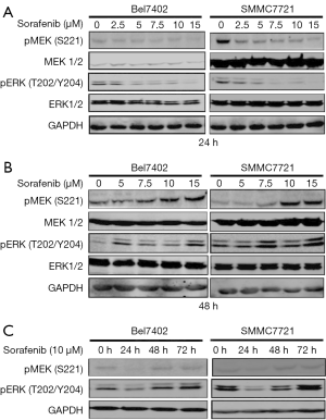 The two HCC cell lines were exposed to increasing concentrations of sorafenib for 24 or 48 hours, and cell lysates were then collected for the detection of MEK/ERK activity (Figure 1A,B). The cells were also treated with 10 µM sorafenib for 24, 48, and 72 hours, and western blotting was then performed to detect the levels of phosphorylated (p)-ERK) and p-MEK (Figure 1C). Our data showed that sorafenib treatment only transiently suppressed p-MEK and p-ERK in the two HCC cell lines, and a rebound in p-ERK was observed by 48 hours, which indicated the re-activation of the MAPK pathway.