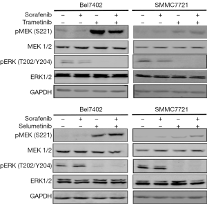 ERK is the only substrate of MEK. Therefore, we investigated whether MEK inhibitors could abrogate the re-activation of ERK caused by sorafenib. The HCC cell lines were exposed to sorafenib for 48 hours, and two selective and potent MEK inhibitors (trametinib and selumetinib) were then co-administered; after 24 hours, the whole-cell lysates were evaluated by western blotting. As shown in Figure 2, combination treatment with either trametinib or selumetinib abolished the rebound in p-ERK, while the p-MEK level was consistent with the feedback loop of MAPK pathway inhibition.