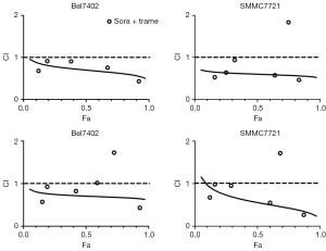 Combination treatment with sorafenib and MEK1/2 inhibitors produced synergistic suppression of HCC cell proliferation