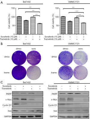 The cells were plated in a 96-well plate in six replicates at a density of 3,000–5,000 cells per well. The following day, trametinib/selumetinib, sorafenib, or combinations as indicated in the figure legends were added. After 72 hours, cell proliferation was determined by a cell counting kit-8 (Dojindo Molecular Technologies, Japan) assay. The cell viability rate was calculated with the following formula: viability (%) = (average OD value of drug-treated sample/average OD value of control sample) × 100%.