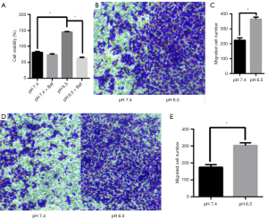 To evaluate the effect of acidic stress on AGS cell migration and invasion in an acidic microenvironment, we performed transwell assays. We found that low pH induced dramatic increases in both cell migration and invasion through Matrigel to the lower chamber in the Transwell assay compared with those in the control group (P<0.05, Figure 5B,C,D,E). These results indicate that acidic stress plays an important role in promoting the migration and invasion of AGS cells.