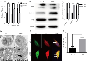 To confirm whether low pH treatment induces an autophagic flux, we transfected/AGS cells with mRFP-GFP-LC3B adenoviruses and monitored the mRFP-GFP-LC3 fluorescence using a fluorescence microscope. An emerging system involving the tandem fusion of LC3 to acid-resistant mCherry and acid-sensitive GFP has been applied for the analysis of autophagosome-mediated dynamic changes in proteins and protein degradation to monitor autophagic flux, as GFP fluorescence is quenched in low pH compartments. A dynamic switch from yellow to red fluorescence reflects a functional autophagic flux. In this system, LC3 is fused to both GFP and RFP to form an RFP-GFP-LC3 vector. As shown in Figure 1E,F cells treated with low-pH condition for 24 h displayed markedly increased numbers of red puncta stably expressing mRFP-GFP-LC3B compared to the control cells (P<0.05), suggesting that acidic stress increases autophagic flux. Taken together, our data suggest that low pH has dynamic effects on the autophagic flux.