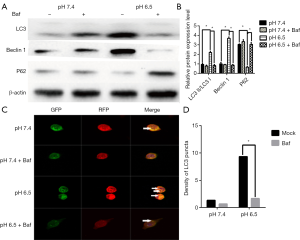 In addition, when cells were treated with the autophagy inhibitor Baf (10 mM, Sigma) at pH 6.5, we found that P62 expression was significantly increased whereas LC3 showed reduced (P<0.05, Figure 2A,B). When detecting the mRFP-GFP-LC3 fluorescence at pH 7.4 in the presence of Baf, we observed that the yellow fluorescent puncta almost did not switch to red puncta after 24 h. However, under pH 6.5 in the presence of Baf, the yellow puncta switched to red fluorescence (Figure 2C,D). These findings suggest that acidic stress can increases the autophagic flux in AGS gastric cancer cells.