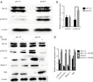 To investigate the relationships among acidic stress, the Erk1/2 pathway, and autophagy, we examined the effect of the MEK1/2 inhibitor, U0126. As shown in Figure 3C,D, U0126 obviously inhibited the expression of p-Erk1/2, as well as that of autophagy related proteins such as LC3 and Beclin1, whereas P62 expression was increased. Thus, inhibition of Erk1/2 resulted in decreased autophagy. These results indicate that acidic stress is mediated through Erk1/2 production and that the acidic microenvironment activates autophagy via the Erk1/2 pathway.