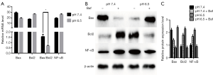 Apoptosis occurs via extrinsic, intrinsic, and ER stress-mediated processes (31,32). To determine whether apoptosis is mediated by autophagy induction in low pH-treated AGS cells, we first measured the expression of apoptosis-related mRNAs (such as Bax and Bcl2) in cells by RT-qPCR analyses. As shown in Figure 4A, acid-induced stress decreased Bax mRNA expression levels and the Bax/Bcl2 ratio, along with increased Bcl2 expression. As shown in Figure 4B,C, AGS cells treated with low-pH displayed significant decreases in Bax expression compared with cells at pH 7.4 (P<0.05). Besides, Bax expression decreased after culture in pH 7.4 with Baf treatment while increased in pH 6.5 with Baf. The above-mentioned apoptosis-related protein is pro-apoptotic protein and these results suggest that acidic stress inhibits apoptosis progression. In addition, we analyzed the expression of Bcl2 and NF-κB, which are anti-apoptotic proteins. As expected, we noted a clear increase in the levels of these proteins in the low pH-treated group. However, cells at neutral pH exhibited relatively weak Bcl2 and NF-κB expression (P<0.05). In order to explain the effect of the autophagy obstruction on the apoptosis progression, we evaluated the anti-apoptotic proteins with Baf, the Western blot results supplied that anti-apoptotic proteins in pH7.4 group with Baf were increased compared to the group without Baf. The expression of these proteins in the pH 6.5 group with Baf was opposed to the result of neutral pH-treated group, which showed decreased than the Baf-negative one. Collectively, these results suggest that acidic stress inhibits apoptosis.