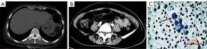 Physical examination at admission revealed an anemic appearance and a soft abdomen with mild tenderness and rebound pain in the right lower quadrant. Laboratory analysis revealed a red blood cell count of 2.37×1012/L (normal reference values: 3.8–5.1×1012/L) and a hemoglobin level of 58 g/L (normal reference values in women: 115–150 g/L). The white blood cell count was normal as well as the levels of the tumor markers carcinoembryonic antigen, CA125, and CA19-9. Human immunodeficiency virus test was negative. A contrast-enhanced computed tomography scan of the abdomen showed free intraperitoneal gas (Figure 1A) and the presence of a gas-liquid mixed density mass localized between the small intestine and sigmoid colon (Figure 1B). No intraluminal mass was found. The patient refused surgery and conservative treatment (consisting of cefmenoxime, 2.0, ivdrip, q12h) was then implemented. An abdominocentesis was performed, showing bloody fluid, and the exfoliative cytology test of the peritoneal fluid further revealed atypical tumor cells (Figure 1C).