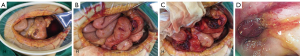 The conservative treatment failed to improve the symptoms as the abdominal pain persisted. An exploratory laparotomy was then performed on September 30, 2016 due to intraperitoneal hemorrhage, although no blood vessels had been injured during abdominocentesis and the bloody peritoneal fluid was not coagulated. Massive bloody ascites were observed, and the mesoileum showed multiple punctate or focal hyperemic lesions (Figure 2A). Additionally, a red mass invading the sigmoid colon was found in the wall of the small intestine at 10 cm distal to the ileocecum (Figure 2B,C). After separation of the small intestine from the sigmoid colon, an intestinal perforation (1 cm in diameter) was visible; hyperemic lesions were also noted in the mesosigmoid (Figure 2C). An intraoperative colonoscopy confirmed a hyperemic mucosal protrusion in the sigmoid colon at 25 cm from the anal verge (Figure 2D). Further, multiple sesame seed-sized nodules were palpated in the pelvic peritoneum, suggestive of a metastatic tumor.