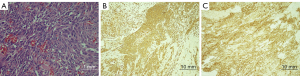 For the literature review, we searched PubMed for case reports published in English using the search terms “primary angiosarcoma and small intestine” and 12 case reports were found. We excluded 5 case reports on secondary angiosarcoma of the small intestine. Overall, we reviewed 8 cases of primary angiosarcoma of the small intestine including our own case (Table 1). These case studies included 5 males and 3 females aged 25–85 years. Four (4/8) patients presented with abdominal pain and 4 patients had GI bleeding (9-12). In 2 cases, including ours, intestinal perforation was the putative cause of acute abdomen (6). In addition, metastases to extra-intestinal sites occurred in 5 cases including our own case. Noticeably, 4 of the 5 cases showed metastases to the peritoneum, demonstrating the invasive nature and metastatic potential of the disease. In one patient, the angiosarcoma that spread to the peritoneum also spread to the liver, among other sites (6); in another patient, the tumor metastasized to multiple organs including the brain (12).