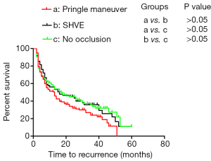 SHVE and the Pringle maneuver were performed in 76 patients and 160 patients, respectively. Additionally, 107 patients underwent surgery without hepatic inflow occlusion. The 1-, 2-, and 3-year TFS rates in all patients without occlusion were 58.7%, 44.9%, and 35.7% (median TFS: 17 months), respectively, and those in the patients who underwent surgery with SHVE were 56.1%, 45.0%, and 35.9% (median TFS: 16 months), respectively. In addition, the 1-, 2-, and 3-year TFS rates in all patients who underwent surgery with the Pringle maneuver were 51.3%, 34.1%, and 24.0% (median TFS: 13 months), respectively. There was no difference in TFS among the patients who underwent the three different surgical approaches (Figure 1).