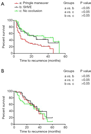 In this analysis, the 214 patients were subdivided into an MVI-positive subgroup (n=111) and an MVI-negative subgroup (n=103). The Kaplan-Meier method was used to analyze the relationship between the different surgical approaches for hepatic inflow occlusion and the prognosis of the HCC patients with MVI. In the MVI-positive group, the 1-, 2-, and 3-year TFS rates were 53.7%, 38.9%, and 32.6%, respectively (median TFS: 13 months). In the MVI-negative group, the 1-, 2-, and 3-year TFS rates were 87.2%, 65.9%, and 47.8%, respectively (median TFS: 32 months). In the MVI-positive group, SHVE was performed in 27 (24.32%) patients, 60 (54.05%) patients underwent the Pringle maneuver, and 24 (21.63%) patients underwent surgery without hepatic inflow occlusion. In the MVI-negative group, SHVE was performed in 32 (31.07%) patients, 37 (35.92%) patients underwent the Pringle maneuver, and 34 (33.01%) patients underwent surgery without hepatic inflow occlusion. As described, in the MVI-positive subgroup, the patients treated with Pringle maneuver had the worst TFS compared to those treated with SHVE and those treated without blood flow occlusion (median: 8 vs. 26 months/8 vs. 35 months) (Figure 3A). No difference was observed in TFS between the patients treated with SHVE and the patients treated without inflow occlusion (P>0.05). However, there was no significant difference in TFS among the patients treated with different approaches for hepatic inflow occlusion in the MVI-negative subgroup (P>0.05) (Figure 3B).