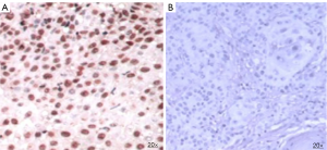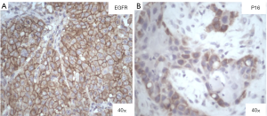 EGFR gene in head and neck squamous cell carcinoma. Onco Targets Ther 2017;10:1527-33. [Crossref] [PubMed] - Kontić M, Milovanović J, Čolović Z, et al. Epidermal growth factor receptor (EGFR) expression in patients with laryngeal squamous cell carcinoma. Eur Arch Otorhinolaryngol 2015;272:401-5. [Crossref] [PubMed]