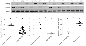 The present results revealed that relative mRNA expression of FAM46B was lower in lung cancer tissues compared to paired paracancerous tissues (Figure 1). Likewise, the protein level of FAM46B displayed a similar trend as its mRNA expression. In contrast, the protein level of β-catenin was higher in lung cancer tissues compared to paired paracancerous tissues.
