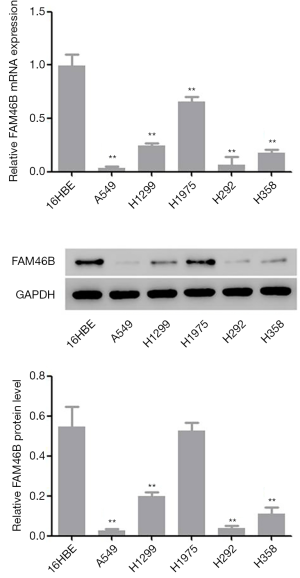 Results from GSEA revealed a correlation between lung cancer metastasis and reduced FAM46B expression (Supplementary file). In the present study, 5 NSCLC cell lines (A549, H1299, H1975, H292 and H358) and 1 human bronchial epithelial cell line (16HBE) were used to investigate the mRNA and protein levels of FAM46B. The results indicated that FAM46B displayed lower expressions in A549 and H292 cells but higher expressions in H1975 cells compared with 16HBE cells (Figure 2). These three cell lines (A549, H292 and H1975) were subsequently used in follow-up experiments.