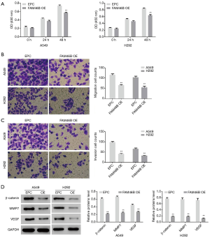 Taken together, our study demonstrated that proliferation, migration and invasion of NSCLC cells are inhibited by FAM46B over-expression and stimulated by FAM46B knockdown. Hence, FAM46B may function as a tumor suppressor in NSCLC by regulating β-catenin, MMP7 and VEGF.