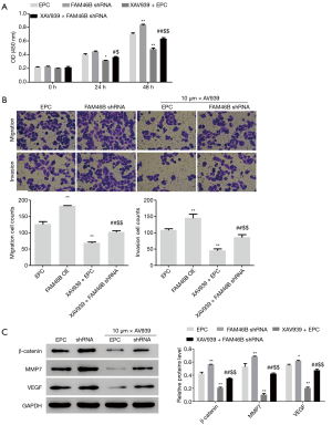 The cell counting kit-8 (CCK-8) assay kit was obtained from Signal way& Antibody (SAB, MA, USA). Trizol reagent and reverse transcription kits were purchased from Thermo Fisher (MA, USA). Crystal violet was obtained from Solarbio (Shanghai, China). FAM46B and vascular endothelial growth factor (VEGF) antibodies were purchased from Proteintech (IL, USA). β-catenin and matrix metalloproteinase 7 (MMP7) antibodies were obtained from Abcam Biotech (Cambridge, MA, USA). Glyceraldehyde 3-phosphate dehydrogenase (GAPDH) antibody was purchased from Cell Signaling Technology (MA, USA).