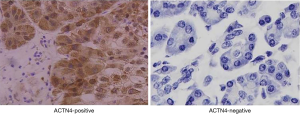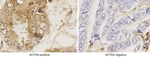 Rabbit anti-human ACTN4 polyclonal antibody was purchased from Abcam. The concentrated DAB Chromogenic Kit and ready-to-use immunohistochemical Elivision Super Test kit were purchased from Fuzhou Maixin Science and Technology Co., Ltd. The TRIzol cell lysates were purchased from Life Technologies (Thermo Fisher Scientific Inc.). The RNA reverse transcription reagent was purchased from the TaKaRa company.