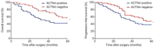 According to the results of the ACTN4 immunohistochemical staining, we divided the patients with HCCs into an ACTN4-positive group and an ACTN4-negative group. In the ACTN4-positive group, the 5-year overall survival rate was 37.044±21.977 months (Figure 4, left panel), and the progression-free survival rate was 33.149±24.147 months (Figure 4, right panel). In the ACTN4-negative group, the 5-year overall survival rate was 50.775±15.272 months (Figure 4, left panel), and the progression-free survival rate was 48.915±18.491 months (Figure 4, right panel). The Kaplan-Meier survival curves revealed that both the 5-year overall survival and progression-free survival rates of the patients with ACTN4-positive HCCs were all significantly lower than those of the ACTN4-negative patients (Manova1 analysis performed in Matlab: P<0.032 overall group, P<0.046 for progression-free group), and the differences were statistically significant.