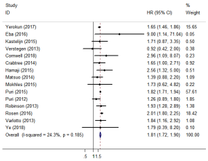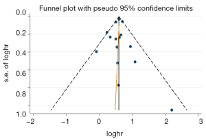 Fifteen studies reported OS (11,12,15-27). The pooled HR showed that surgery was associated with a significantly higher OS than SBRT (HR =1.81; 95% CI, 1.72–1.90; P=0.000; Figure 2). The sensitivity analysis demonstrated that the result of OS was relatively stable and credible (Table S2). However, the matched baseline characteristics in each study were not consistent (Table S1). We restricted studies to the same matched and comparable characteristics, and the results are shown in Table 2. The effect estimates of SBRT versus surgery for each of the subgroups were as follows: matched on six characteristics (11,20,23,25,26) (HR =1.769; 95% CI, 1.223–2.559; P=0.002); matched on seven characteristics (11,20,23,25) (HR =1.650; 95% CI, 1.112–2.447, P=0.013); matched on eight characteristics (11,20,23) (HR =1.623; 95% CI, 0.848–3.106; P=0.144); and matched on nine characteristics (11,20) (HR =1.156; 95% CI, 0.623–2.146; P=0.646). The sensitivity analysis demonstrated that some of the results of OS for studies that were restricted to the same matching and comparable characteristics were not stable (Table S3).