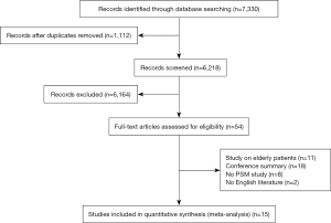A total of 7,330 studies were identified from the databases, among which 54 were included in the full-text evaluation. Fifteen retrospective studies were included in this meta-analysis (11,12,15-27) (Figure 1). All the included studies were of moderate quality at least. Table 1 shows the basic characteristics of the 15 studies. Among them, 6 studies compared SBRT with lobectomy.