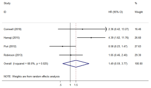 Four studies (12,18,23,26) assessed CSS. The forest plot is shown in Figure 3. The CSS (HR =1.49; 95% CI, 0.59–3.77; P=0.401) was similar between SBRT and surgery treatments. The sensitivity analysis excluding Hamaji’s research (Table S2) showed that the HR =0.919; 95% CI, 0.50–1.70, the CSS still similar between SBRT and surgery treatments.