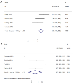 There were 8 studies that reported FFP, DFS, or RFS according to the definitions in the literature. Four studies defined FFP or DFS as the time from the start of treatment until tumour recurrence or death (22,23,25,26). Surgery showed significantly better outcomes compared with SBRT (HR =2.25; 95% CI, 1.65–3.06; P=0.000; Figure 4A). The other four studies (11,15,16,20) defined RFS as freedom from any tumour recurrence, and the pooled results showed that there was no significant difference between surgery and SBRT (HR =0.73; 95% CI, 0.34–1.60; P=0.434; Figure 4B). According to the results of the sensitivity analysis, the pooled results are relatively stable and credible (Table S2).