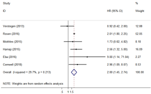 Six of the included studies (11,17,20,23,24,26) performed a comparative study of lobectomy and SBRT for stage I/II NSCLC. A pooled analysis of these 6 studies showed that lobectomy had a better survival benefit over SBRT (HR =2.00; 95% CI, 1.45–2.74; P=0.000; Figure 6), and the sensitivity analysis also showed similar results (Table S2). The pooled results from analyses restricting studies to those with comparable characteristics are shown in Table 3, and the effect estimates of SBRT to lobectomy for each subgroup were as follows: matched on three characteristics (11,20,23,24,26) (HR =2.044; 95% CI, 1.150–3.634; P=0.015); matched on six characteristics (11,20,23,26) (HR =1.837; 95% CI, 1.068–3.158; P=0.028); matched on eight characteristics (11,20,23) (HR =1.623; 95% CI, 0.848–3.106; P=0.144); and matched on nine characteristics (11,20) (HR =1.156; 95% CI, 0.623–2.146; P=0.646). The sensitivity analysis of studies that were restricted to the same matched and comparable characteristics showed that the results were not very stable (Table S3).
