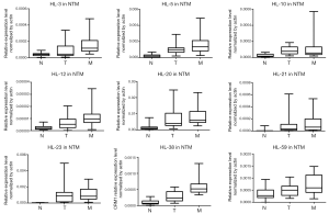 We evaluated the 63 lncRNAs expression by qRT-PCR analysis in cohort 2, which included 21 patients with CRLM. The results validated the expression trend of N < T < M in 9 candidate lncRNAs (Figure 2). Five candidate lncRNAs were excluded for subsequent analysis, because of low expression level (e.g., HL-12) or no significantly difference among N, T and M tissues (e.g., HL-3, HL-10, HL-21, HL-23).Finally, four lncRNAs (HL-5, HL-20, HL-38, and HL-59) with the trend of N < T < M were analyzed in the subsequent screening experiments.