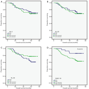 Then we detected the expression of these 4 lncRNAs in 108 colorectal cancer tissues using qRT-PCR, and analyzed the prognosis value of these lncRNAs. The three lncRNAs (HL-5, HL-20 and HL-38) had no associated with overall survival. However, high expression of HL-59 (CASC19) was associated with poor prognosis (P=0.013, Figure 3). Furthermore, the patients were divided into high (n=32) and low (n=76) CASC19 expression groups according to the receiver operating characteristic curve of CASC19 levels. Univariate analyses showed patients with high CASC19 expression had a poorer prognosis compared to patients with low CASC19 expression (P=0.013, Table 1). The CASC19 aberrant high expression level was significantly correlated with distant metastasis (P=0.026) and mid-highly differentiated histological grade (P=0.018) (Table 2). However, there was no relationship between CASC19 expression and other factors such as sex (male vs. female), age (≤60 vs. >60), and lymph node metastasis (N0 vs. N1 or above).