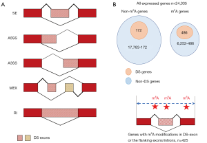 There are five types of alternative splicing patterns, SE (skipped exon), A5SS (alternative 5' splice site), A3SS (alternative 3' splice site), MEX (multiple exclusive exon) and RI (retained intron) (Figure 1A). In the mRNA-Seq data of si-METTL3 vs. control, any types of splicing with FDR <0.05 are defined as DS events (Methods). The genes with DS events are defined as DS genes when METTL3 was knocked down.