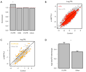 We profiled the TE foldchange of all genes in si-METTL3 vs. control. The TE of the 6,252 m6A genes are globally down-regulated when METTL3 was knocked down (Figure 2B), which agrees with previous knowledge (6). Among the 486 DS m6A genes, the genes with DS events in 5'UTR are highlighted against genes with DS events in other regions (CDS, 3'UTR and intron are combined) (Figure 2C). We could see that the gene with DS events in 5'UTR tend to have greater changes in TE (either increase or decrease). Furthermore, the absolute values of TE foldchange clearly show that the genes with DS events in 5'UTR alter their TE more severely than those with DS events in other regions (Figure 2D).