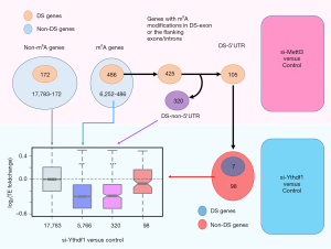 To test our hypothesis, we retrieved the m6A genes in HeLa cells. In the METTL3 knock-down libraries (6), we examined the global changes in mRNA splicing patterns as well as TE. The differential splicing (DS) genes are enriched in m6A modified genes and the DS events are relatively enriched in 5'UTRs. The 105 genes with DS events in 5'UTR alter their TE more strongly than the genes with DS events in other regions (CDS/3'UTR/intron). Furthermore, the splicing pattern of 98 out of those 105 genes are unaffected by reader YTHDF1. Importantly, we did not observe significant TE changes for these 98 genes when YTHDF1 was knocked down.