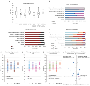When age, stage and exposure were considered together, increased smokers were found in stage IIIA–IV, but there was only small age distribution imbalance (Figure 1E). HCU patients were apparently younger in all the stages and had a higher ratio in stage IIIA–IV (Figure 1F). Double-negative subjects were mainly in stage I–II with relatively older age. Union set patients covered large age span (40–82 years), showed clearly early-onset and made the majority of stage IIIA–IV cases. Double-positive patients were mainly found in stage IIIA–IV with wider age span (range, 38–75 years) (Figure 1G).