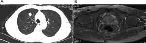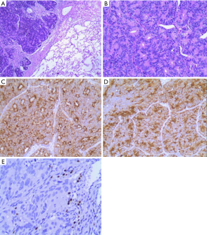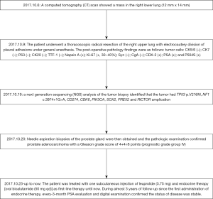 In October 2016, a 74-year-old male non-smoker presented to our hospital for a physical examination, which revealed a pulmonary mass. A computed tomography (CT) scan showed a mass in the right lower lung (Figure 1). The patient had non-special comorbidities, family and psycho-social history. The patient was given treatment options and chose observation. A repeat contrast-enhanced CT one week ago in our hospital showed a nodule in the right upper lobe of the lung with malignant signs, which was considered to be primary lung cancer. Tumor biomarker testing showed the following: alpha fetoprotein (AFP), 2.48 ng/mL; carcinoembryonic antigen (CEA), 2.64 ng/mL; ferritin, 141.0 ng/mL; squamous cell carcinoma-associated antigen, 0.60 ng/mL; carbohydrate antigen, 199 <2.00 IU/mL; free PSA, 0.6 µg/L; and total PSA, 3.0 µg/L. The patient underwent a thoracoscopic radical resection of the right upper lung with electrocautery division of pleural adhesions under general anesthesia. The post-operative pathology findings were as follows: tumor cells: CK5/6 (–); CK7 (–); P63 (–); CK20 (–); TTF-1 (–); Napsin A (+); Ki-67 (+,30–40%); Syn (–); CgA (–); CDX-2 (+); PSA (+); and P504S (+) (Figure 2). Then, a next generation sequencing (NGS) analysis of the tumor biopsy identified that the tumor had TP53 p.V216M, NF1 c.3974+1G>A, CD274, CDK6, PIK3CA, SOX2, PREX2 and RICTOR amplification (3D Medicines, Shanghai, China) Based on hematoxylin-eosin staining and immunohistochemistry, the tumor met the criteria for a poorly differentiated adenocarcinoma (approximately 1.8 cm in diameter) and was likely metastatic from a primary prostate tumor. A prostate magnetic resonance imaging (MRI) suggested prostatic space-occupying lesions involving the seminal vesicles bilaterally (Figure 1), with a high possibility of prostate cancer. Needle aspiration biopsies of the prostate gland were then obtained and the pathologic examination confirmed prostate adenocarcinoma with a Gleason grade score of 4+4=8 points (prognostic grade group IV). The patient was treated with one subcutaneous injection of leuprolide (3.75 mg) and endocrine therapy [oral bicalutamide (50 mg qd)] as first-line therapy until now. During almost 3 years of follow-up since the first administration of endocrine therapy, every-3-month PSA evaluation and digital examination confirmed the status of disease was stable (Figure 3). This patient tolerated and adherent to the endocrine therapy quite well except grade 1 appetite and pubic hair loss, respectively.