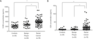 Rectal cancer concerned about cancer of the large intestine and rectum is one of the most common malignancies that affect the digestive system. As with most other neoplasms, the incidence rate for rectal cancer rises dramatically with age. In the United States, an estimated 135,430 cases of rectal cancer are diagnosed in 2017, resulting in approximately 50,260 deaths (1). The key to decreasing rectal cancer mortality is early detection, diagnosis and treatment. However, most rectal cancer patients miss the optimal treatment strategy and have poor prognosis owing to no early warning signs and symptoms. At present, the early diagnosis and prognosis of rectal cancer mainly depend on colonoscopy, imaging and other examinations with relatively high expenses. Patients exhibit very low levels of adherence on subsequent return to the hospital. In the diagnosis and therapy of rectal cancer, molecular tumor markers have been playing an increasingly vital role. However, conventional biomarkers like carcinoembryonic antigen (CEA) are unable to satisfy the demand of patients in clinical practice. For over 40 years, American Society of Clinical Oncologists has recommended performing routine measurement of CEA to monitor local recurrence or metastatic relapse in rectal cancer patients, however, CEA increase only occurs for 38.7% of rectal cancer (2). In addition to rising in most rectal cancer, pancreatic cancer, stomach cancer, lung cancer, and breast cancer, the CEA is also seemed to be slightly elevated in some benign diseases. Therefore, it is of great significance to identify effective serum biomarkers with both satisfactory sensitivity and specificity to detect rectal cancer before surgery and to predict the prognosis.