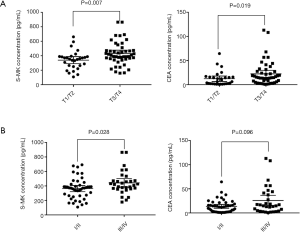 Both levels of S-MK and CEA in T3/T4 phases were higher than those in T1/T2 phases, more significant in S-MK (P=0.007) than CEA (P=0.019). No marked correlation was observed between S-MK, CEA and nodal involvement, or distant metastasis (Table 2). Both levels of S-MK and CEA gradually increased along with the stage. S-MK was higher in stage III/IV comparing to stage I/II [426.55 (360.72–471.12) vs. 298.33 (184.62–340.93) pg/mL, P=0.028]. CEA was also higher in stage III/IV than in stage I/II but with no significantly difference [17.03 (3.15–30.48) vs. 10.32 (1.03–25.59) ng/mL, P>0.05 (Table 2). In order to investigate the relationship between S-MK, CEA and clinicopathological variables, the scatter graphs were plotted (Figure 2).