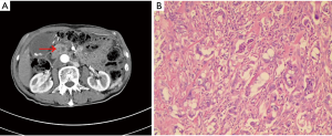 A 75-year-old man with a previous history of rectal polypectomy in 2013 underwent a pancreatoduodenectomy (PPPD) in December 2014 for pancreatic head cancer (Figure 1A). The patient didn’t have any special medical, family and psycho-social history. Histopathology showed an adenocarcinoma with perineuronal invasion (Figure 1B). Only one regional lymph node was resected, with no invasion. No cancer cells were found in the margin of the resected tissue, indicating an R0 resection. The pathologic staging of the adenocarcinoma was IIA stage (pT3N0M0) according to American Joint Committee of Cancer (AJCC) criteria, eighth edition. We didn’t collect genetic information because few mutations were found in pancreatic adenocarcinoma and there were few effective targeted therapies for pancreatic adenocarcinoma.