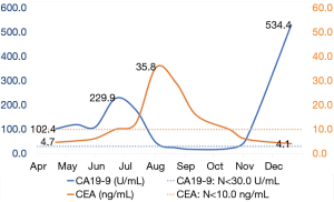 The patient received no further treatment after the surgery until April 2016, when an increase in serum carbohydrate antigen 19-9 (CA19-9), at 102.4 U/mL (N<30.0), was found during follow-up. Nine courses of chemotherapy with gemcitabine (1,000 mg/m2, days 1 and 8, 3 weeks for one cycle) and capecitabine (1,250 mg/m2, days 1 to 14, 3 weeks for one cycle) was applied, despite a lack of radiological [computed tomography (CT)] evidence of relapse or metastasis. For subsequent maintenance, the patient was treated for two courses with capecitabine (1,250 mg/m2, days 1 to 14, 3 weeks for one cycle). During chemotherapy, routine CT scans were performed every 2 months, with no sign of relapse or metastasis noted. The serum CA19-9 level had decreased to 17.2 U/mL in September 2016, but there was a sudden re-increase to 534.4 U/mL in December 2016 (Figure 2).