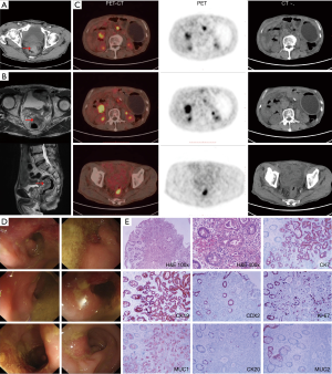 In January 2017, the patient started complaining of bloody stool with increased defecation frequency (3–4 times per day). Chest and abdomen CT on February 17 revealed a high-density shadow in the thickening wall of the cecum (Figure 3A). Magnetic resonance imaging (MRI) of the lower abdomen on February 27 revealed a mass located in the middle and lower section of the rectum, with the peritoneum refolded (Figure 3B). Multiple small lymph nodes around the tumor were noted. A soft-tissue shadow with high metabolic activity in front of the right kidney and multiple enlarged lymph nodes behind the retroperitoneum were observed by positron emission tomography-computed tomography (PET-CT) (Figure 3C). Colonoscopy revealed an irregular mass at about 5–7 cm from the anus in the rectum, occluding 50% of the lumen (Figure 3D). Histological examination (hematoxylin and eosin staining) of biopsy specimens taken from the mass revealed an adenocarcinoma. However, a further increase in serum CA19-9 to 3,426 U/mL prompted us to further explore the possibility of relapse or metastasis of the previous pancreatic adenocarcinoma. Subsequent immunohistological analysis showed the specimens to be positive for cytokeratin 7 (CK7), cytokeratin 19 (CK19), CDX2 protein, Ki-67 protein, mucoprotein 1 (MUC1), and negative for cytokeratin 20 (CK20) and mucoprotein 2 (MUC2) (Figure 3E). These results indicated that the rectum lesion might have originated from the pancreas adenocarcinoma that was previously resected.