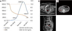 From March 9, 2017, palliative radiotherapy (50 Gy/25 fractions) targeting the rectum neoplasm and pelvic lymph drainage was administered; however, in consideration of the patient’s poor physical status, concurrent chemotherapy was not applied. After radiotherapy, the serum CA19-9 level had decreased significantly on April 7 to 1,255 U/mL (Figure 4A). On May 24, the patient received rectal MRI, revealing a slightly shrunken tumor (Figure 4B). On July 7, the patient was admitted to the emergency department for a severely distended abdomen. CT examination revealed an enlarged gastric cavity with retention of contents and an irregular soft tissue shadow in front of the right kidney (Figure 4C). The patient ultimately died on August 28 due to the increased tumor load (Table 1).