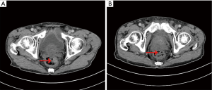 A recheck of the previous CT images from November 2017 showed a small, high-density shadow inside the rectal wall (Figure 5A) that was not observed in the images from September 2017 (Figure 5B). Because of the patient’s previous history of rectal polypectomy, the shadow was neglected by both the radiologist and the oncologist.
