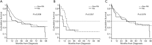 No significant difference in survival was found between LC patients with versus without RA, including in subgroup analysis of SCLC and NSCLC. Notably, regarding the association of RA with poor outcomes in LC patients, the presence of RA could be a significant factor impairing overall survival in SCLC, but not NSCLC, patients. Future studies assessing the relevance of RA to the prognosis of LC patients should recognize that the histological subtype may affect the outcome.