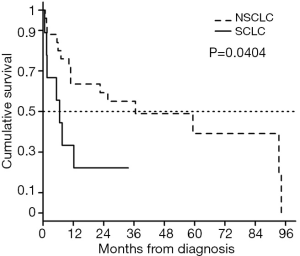 During the study period, 22 (64.7%) LC patients with RA and 76 (57.6%) LC patients without RA died (Table 1). The overall survival rate did not differ between LC patients with RA and age- and sex-matched LC patients without RA (Figure 1A), even when the survival analysis was conducted on SCLC and NSCLC patient subgroups (Figure 1B,C). Risk factors predictive of overall mortality based on multivariate Cox model analysis are listed in Table 2. Among LC patients of all histological subtypes, low BMI, older age at LC diagnosis, high CCI score, small cell histology, and advanced stage IV disease were significant risk factors for mortality. The status of RA was not a significant predictor of mortality after adjusting for other variables. SCLC is a more aggressive subtype of LC than NSCLC (20). As expected, mortality was significantly worse in RA patients with small cell histology compared to those with NSCLC (P=0.0404, Figure 2). Risk factor analysis was therefore conducted regarding mortality in LC patients with RA according to histological subtype (SCLC vs. NSCLC). We found that RA (HR: 3.26; P=0.0350) was a poor prognostic indicator for SCLC patients, along with high BMI (HR: 1.26, P=0.0275) and stage IV disease (HR: 5.28; P=0.0033). However, RA did not influence the mortality risk in NSCLC patients. Low BMI, high CCI score, smoking, and advanced stage IV were significant risk factors for mortality in NSCLC patients. Table 3 represents results from univariate and multivariate analysis of mortality according to the two main histological types of NSCLC (lung adenocarcinoma and squamous cell carcinoma). There were 92 (55.4% of total) patients for lung adenocarcinoma and 37 (22.3%) for squamous cell lung cancer. Lung adenocarcinoma histology was a more favorable risk factor predictive of mortality in NSCLC patients, compared to squamous cell carcinoma, but there was no statistical significance (HR: 0.53, P=0.0565). In multivariate analysis of patients with lung adenocarcinoma, male gender (HR: 0.25, P=0.0052), BMI (HR: 0.83, P=0.0002), ever smoking (HR: 4.20, P=0.0035), and advanced stage IV disease (HR: 2.76, P=0.0094) were significant factors associated with mortality. Among those with lung squamous cell carcinoma, only advanced stage IV disease was a significant factor for mortality. This study, however, the presence of RA had no significant impact on the mortality even in two subgroups with lung adenocarcinoma and squamous cell carcinoma.